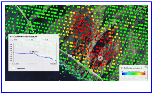 2017年5月20日,美国加州沿海1号高速路发生滑坡,数百万吨泥石阻塞了公路,还使得事发地海岸线外新增了大约5公顷陆地。欧洲哨兵-1卫星上的雷达,在两年前就捕捉到山体的运动,借助小基线子集干涉法(Small Baseline Subset interferometry,SBAS)技术处理过的雷达数据,获得大面积山体移动的高敏感信息。图中红点表示陆地在以每年70毫米以上速度远离卫星,绿点则表示周围稳定。(来源:ESA)
