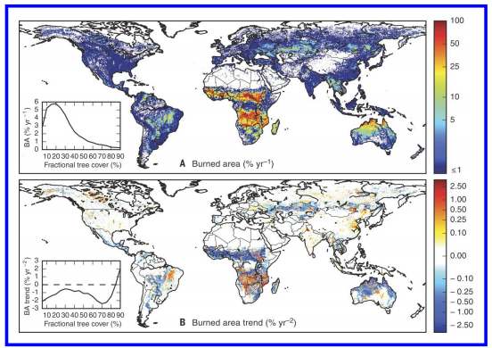 美国、德国、中国、加拿大和法国等国学者,利用过去18年卫星观测数据的研究发现,主要是人为导致的林火过火面积减少了大约五分之一。上图给出全球平均燃烧面积分布,下图给出林火面积减少趋势。(来源:Science)