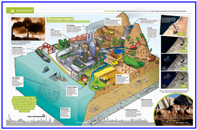 很有影响的科普期刊HOW IT WORKS最新一期,用全景图的形式梳理了人类对地球环境影响,这些影响或许可以让地质学家用来定义人类世的到来。(来源:HOW IT WORKS)
