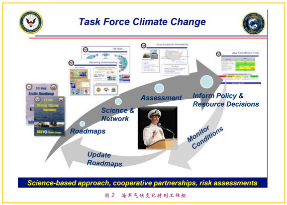 加劳德特曾在美国海军气候变化特别工作组(图2)担任副职,参与海平面上升问题的研究。出身海军的他密切关注海洋和大气对海军作战的影响(图3),同时其自身在观测和理解海洋物理方面有着丰富的专业知识,是气候变化论相信者。在其担任海军气候变化特别工作组副主任期间,加劳德特在一段采访中提到,为保护濒危物种,他规定所有海军设施必须维护其训练范围内的栖息地及物种。但是已有的观测证据表明,不断变化的天气和降水形势正对这些地区产生着影响。海军也正在建立方案来应对这些变化,努力减轻影响。其所有决策和建议都是基于最先进的科学。加劳德特表示,美国海军与国防部其他部门一起正在采取行动应对气候变化,但海军需要美国公民的支持以实现其气候变化目标。关于气候变化的少数怀疑论者,加劳德特表示,在他们完成调查之后发现,几乎每个有环境科学项目的大学都承认温室气体排放与人为强迫和气候变化之间的关系,而且不可忽视的是,许多联邦和国家研究机构,如美国科学院以及NOAA也持相同意见。因此我们必须相信这一点。