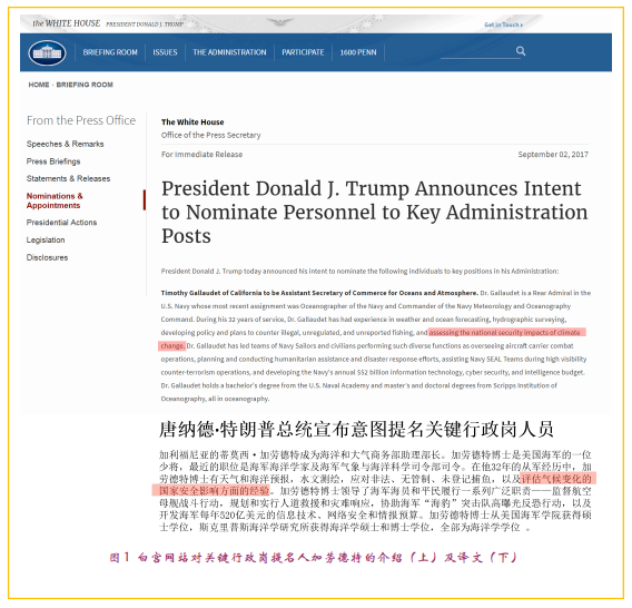 美国政府网页,在针对总统提名的介绍中,给出以下针对加劳德特的介绍(图1)。在美国政府网页,总统提名的联邦官员背景介绍中,出现“气候变化”字眼且是很“正面”意义的介绍,加劳德特是不多的几个人。这或许和8月美国飓风肆孽有关,但更可能是象征性的意义,就如同新一届政府在声明退出气候变化“巴黎协议”后,在国际上压倒性的舆论压力下,做出某种让步的“迹象”。但是,无论怎样,加劳德特的提名,目前正在走国会审核程序。针对这一提名以及NOAA未来的走向,可以进行以下解读和猜想。