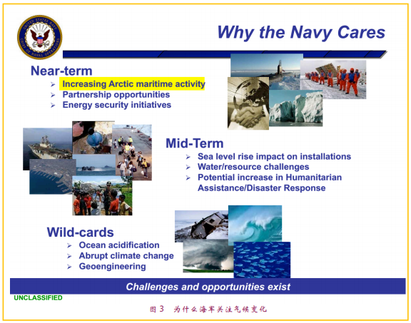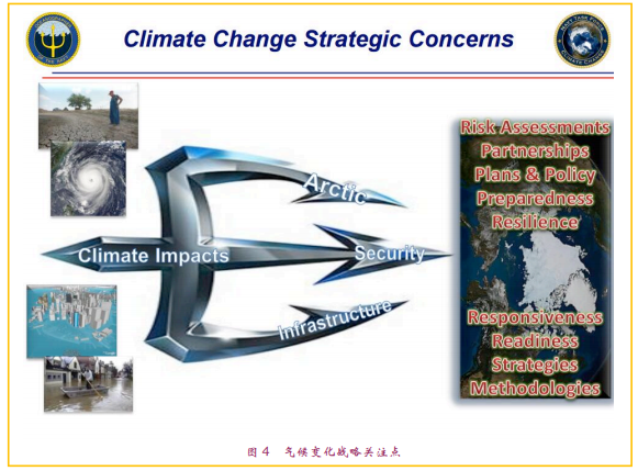 2016年6月,加劳德特被评为加州大学圣迭戈分校(斯克里普斯海洋学研究所隶属其下)5位荣誉校友之一时,接受采访时也提到海军在气候变化方面的考虑。他作为海军海洋学家和领航员,主要职责是提供敏感特殊行动任务的现场天气信息,以及与船只和潜艇密切相关的海洋状况。同时也做气候变化对海军基地、全球导航和边境战争的长期影响规划(图4)。他表示海军在分析海平面变化对基地的影响,据结果修改基地修建规划,根据水面上涨更新或移动设施。同时,考虑到“运油船容易被袭击”,军事部队正改用更有效率和可持续的能源,节约成本和提高安全性。他说气候变化导致更严重干旱会在发展中国家造成食物和饮水不稳定,引发像叙利亚内战这样的冲突。海军在为这种不稳定性做准备。此外还提及热带风暴增强导致的人道主义危机。而海军上层也在对北极海冰减少,夏季途径北极的航运开启做准备。这会影响从北极石油开采到西北航线豪华游轮等一系列行动。海军将对这些有冰且未测量水域的潜在冲突和高风险营救有所准备。他还表示海冰破碎改变了海洋结构,因此海军在重新制定新环境下的战略。
