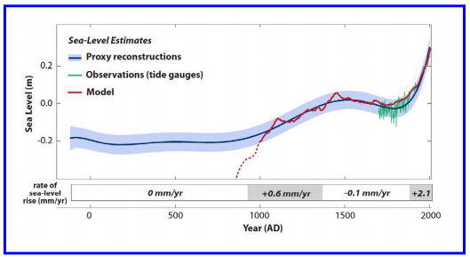 美国科学院(NAS)最新出版的关于可持续海洋观测与认识地球气候未来变化的报告里,给出多种手段获得的过去2000年以来海平面的估计:包括替代数据(蓝色)、海洋潮汐站观测(绿色)和统计模式基于观测的估计(红色)。图中红色虚线表示模式估计偏离替代记录。图下方给出不同时段的变化速率。(来源:NAS)