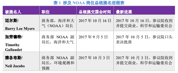 美国历届新任总统上任后的一项最重要的工作,就是通过提名各联邦部门负责人,实现真正意义上的“组阁”,并按照既定战略运行整个国家。而需要通过这样的程序得到提名的岗位,基于美国目前的联邦政府结构,多达558个。这些岗位中,和科学密切相关的仅占约十二分之一,为46个,因此备受科技界人士的重视。NOAA需要总统提名任命的岗位,即NOAA局长和2位副局长,应该在46个岗位中,最受到美国气象界乃至全球气象同仁的关注。美国总统在尚有大量岗位等待提名的状态下,最近一个月左右时间完成了3个NOAA相关岗位的提名(表1),这或许和美国夏末接连遭受的飓风袭击有关,但更可能是伴随美国退出气候变化巴黎协议后,在气候变化问题上特朗普决意一条路走到底,因此加快其政府层面上对相关机构的控制。