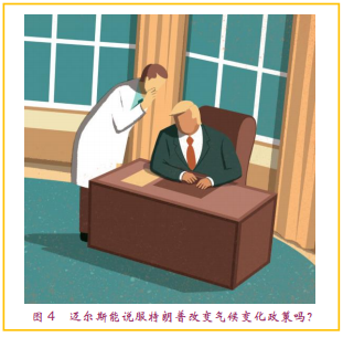 2.用美国《科学》杂志针对迈尔斯获得提名的报道中的话来说,NOAA新班子里“房间中的大象”就是气候变化问题。可能会作为NOAA新班子的班长的迈尔斯,和副班长之一雅各布斯从没有就这个问题进行过明确的表态,而另一位副班长加劳德特则是支持气候变化研究的实践者,这就会让“班长”成员在气候变化问题上统一思想有了一定难度,再考虑到目前美国和全球舆论对特朗普政府在气候变化政策方面的蔑视态度,这样的统一无疑挑战性更强。实际上,这个问题也有两面性。一是如果特朗普总统在气候变化问题上一意孤行,继续走不认国际协议和国内扼杀气候变化研究的路,在NOAA层面上作为联邦机构,可选择的政策、可有所作为的空间实际上并不大。二是尽管迈尔斯和AccuWeather与其商界对手TWC(天气公司)有所不同,在气候变化方面选择不发声,但是无论是公司还是迈尔斯本人,公正地看都是气候变化的中立派,远没有总统先生那样激进。2014年,迈尔斯在接受华尔街杂志采访时指出:“我们告诉公司里的科学家,如果你有气候预报的特别技巧,如果你想让你的专业观点发声,我们的平台向你开放。但是我们不想让他们卷入这场[气候变化]争执的政治漩涡里。”或许这样的中立态度,代表了非科学学位企业家看问题的不同之处。这样的中立或许让人们期待,迈尔斯能够说服美国总统采用类似的态度面对气候变化问题(图4)以减轻压力。