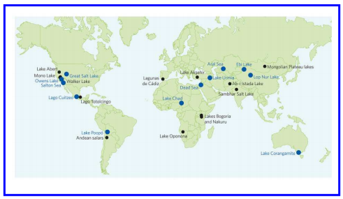美国学者在一项研究中指出,实际上很多咸水湖正在以令人担忧的速度缩小,这将减少水鸟的栖息地、影响经济收益从而威胁人类健康。图中给出世界上受到分流引水和气候变化威胁的一些咸水湖,其中较大的图标是指面积曾经大于250平方千米的湖泊。(来源:Nature-Geo)