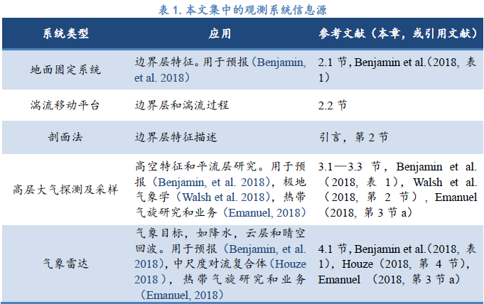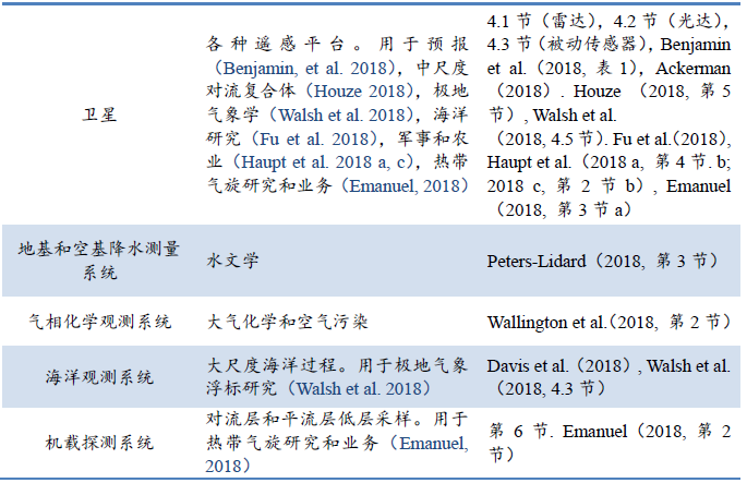 大气观测系统对气象学的几乎所有方面都是必不可少的。尽管没有篇幅描述今天在使用的很多系统,但也有一些文献可以参考,包括本文集的其他章。表1摘要给出在本文集中一些特殊类型观测系统的相关信息。卫星观测系统被广泛应用,是本文集中2章中关注的观测系统平台(Fu et al.2018; Ackerman et al.2018)。本章4、5节给出一些常用卫星遥感系统信息。降水观测系统包括在水文章节(Peters-Lidard et al. 2018)。在表1中给出本文集中不同特殊气象应用领域的例子。