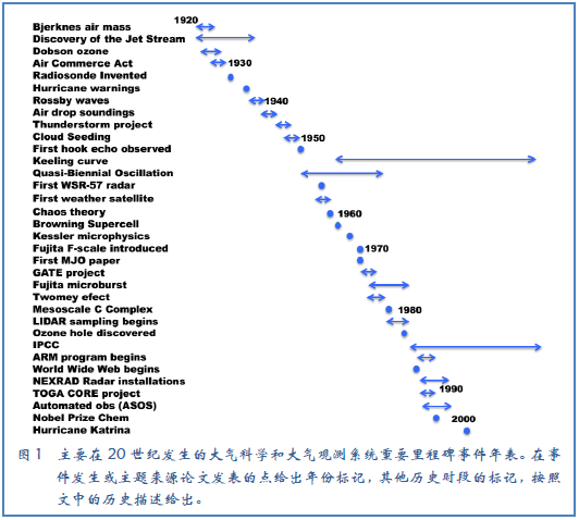 图1给出过去100年里大气科学的一些重要发现的时间表,其中有一些观测系统的里程碑。图1中,原始创新论文被标记为里程碑事件,尽管在很多情况下论文基于之前的工作并且在发表后该主题的研发持续开展。在一些情况下,如我们后面的讨论,一些论文、外场试验或装置覆盖了更长的时段。