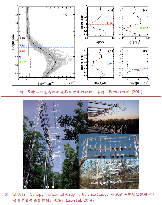 地表气象条件一直是过去100年里容易获取的,使得PBL观测系统取得重要改进。PBL研究的一个关键需求是湍流变量的观测,因为无处不在的湍流是PBL有别于其上层覆盖的自由对流层(FT)的基本属性。这一固有的湍流性质意味着量化PBL结构,需要观测平均标量(如温度、湿度和化学物),标量和动量通量等湍流变量,以及标量和动量的方差。虽然实地观测是PBL观测的主流,但存在重要的局限。一是传感器的影响以及这种影响的所观测对象属性的结构。另一个是观测点的局限。后者可以通过传感器阵列(例如Patton et al.2011)得到一定程度的解决,但是传感器的数量在实际中依然有限制。获得沿拓展路径同时观测的一个方法是用遥感技术,包括主动遥感如雷达、光达、声达(sodar,SOnic Detection And Ranging)、声学层析成像和闪烁计数器等,以及被动技术(如微波辐射仪和光谱仪)。边界层高度是另一个重要的PBL属性并可用遥感观测(例如Luo et al.2014)。很多这类技术在Wilczak et al.(1996)中进行了讨论,雷达和光达技术在第4节中讨论。Geerts et al.(2017)给出下一代对流和湍流观测技术的概要。