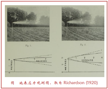最重要的湍流变量之一是垂直动量输送,或称为应力。即使在观测应力的传感器开发之前,依据简单但精细、替代方法获得了估计值。例如,Richardson(1920)通过跟踪地面点源释放的“蓟花的冠毛”(即蓟种子周边轻羽毛物质)的轨迹,后来通过估计麦地里茎秆弯曲所需的力(Richardson 1922),来估计近地表应力。