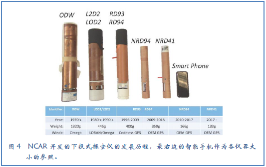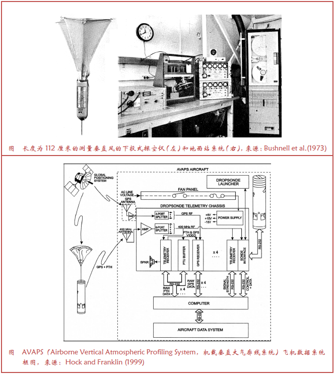 对覆盖地球2/3的海洋进行实地探测的困难一直广为人知,海上探测需要繁重的后勤保障,特别是在风暴肆虐时。然而,当风暴对于居住在陆地上的人群构成威胁时,这种观测又特别有用。1943年,陆军上校Joe Duckworth飞入位于休斯顿附近的飓风眼区,开启了飓风巡查的新纪元。但是,因为穿越激烈风暴的飞行极具危险性,从飞机上发射仪器进入风暴进行附加观测就成为有吸引力的方式。1960年代后期,NCAR研发了下投探空系统,该系统可以从飞机上投放到雷暴中(Bushnell et al.1973)。1970年代早期基于Omega全球导航系统的风探测加入其中(Govind 1975)。LORAN风探测和后来的GPS和先进探测器也成为投放仪器(Hock and Franklin 1999,图4)。下投式探空仪成为飓风巡视的核心仪器,极大提升了飓风如何发展和影响哪个区域的预报能力(Burpee et al.1996)。它们为很多在数据稀疏区域依靠目标观测的研究项目填补了重要的空白。