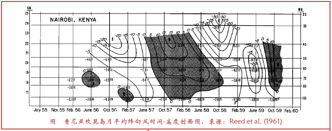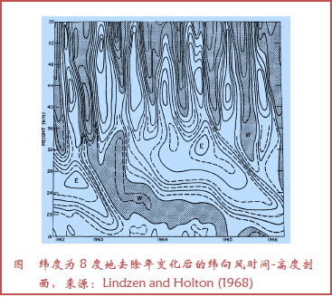 平流层风分析,始于1955—1960年间在内罗毕坎顿岛和圣诞岛施放的探空仪(McCreary 1959; Reed et al.1961),分析给出对流层低层风随时间出现的减弱,并被称为准两年振荡(Quasi-Biennial Oscillation,QBO, Ebdon and Veryard 1961)。最先对QBO作出理论解释的是Lindzen and Holton(1968),他们给出波动平均流相互作用的新理念(图1)。