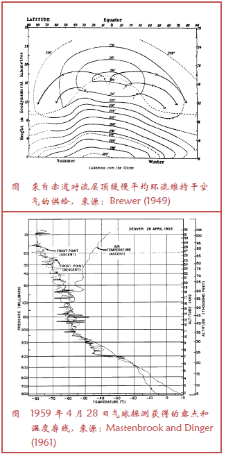1940年代初,Alan West Brewer在皇家空军气象研究飞机上进行了第一次英格兰上空平流层水汽观测。这些观测主要是为了认识飞机尾迹凝结形成以支持二战战事。但是,它们带来了认识平流层动力学的革命。他和Gordon M.B.Dobson推断,在热带对流层顶空气注入平流层(Dobson et al.1946;Brewer 1949)。他们的模型首次描述了一般平流层环流。但是,能对热带平流层水汽观测时,时间又过去了20年。1950年代后期,在一些地点开展了用霜点湿度计对平流层的观测。海军研究实验室的John Mastenbrook开发了低温过冷霜点湿度计,因为尺寸足够小可作为橡胶气球的负载(Mastenbrook and Dinger 1961)。与温度观测不同,上升使得水汽观测因随气球携带的水汽以及负载本身一般会受到干扰。为了避免这个问题,他开发了从小型橡胶气球释放气体的方法,能够在下降时观测水汽。他将该仪器用在太平洋的一些岛屿、印度以及特立尼达拉岛开展的观测中(Mastenbrook 1965;1966),并收集到2年热带平流层水汽数据,该数据集又是之后40年里没有被重复的。这些观测证实了Brewer和Dobson关于平流层干燥的假设。1980年该仪器被送到位于科州波尔多的NOAA,原始仪器的一些仿造仪器依然在用,并且形成了全球平流层水汽最长数据系列(Hurst et al.2011),是气候变化敏感的指标(Solomon et al.2010)。