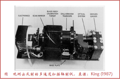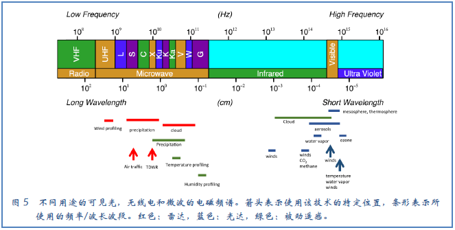 利用电磁光谱中可见、红外和微波部分的遥感设备能够反演出大气的属性(图5)。云和气溶胶属性的观测都应用了可见和红外谱段。一个早期的例子是空基多通道云辐射计(Multi-channel Cloud Radiometer,MCR),被King(1987)用来通过观测可见光反射比获得云的光学厚度,后来被Nakajima and King(1990)用来获得利用可见和近红外观测得到有效粒子半径。该技术后来的更新带来了MODIS/ASTER(MASTER)空基模拟器,支持校准、验证,以及星载仪器(例如MODIS和ASTER)算法的研发(King et al.1996; Hook et al.2001)这一空基活动的共同目标(例如Kramer 2002)。