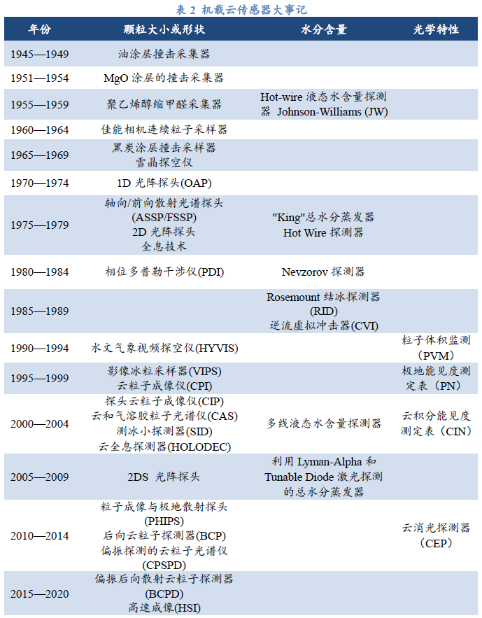 如Pruppacher and Klett(2010)所述,云粒子的最早空基观测由Wigand在20世纪开始时完成,据推测后者在一个观测平面上捕捉到了云粒子。如表2,在大约40年后,从驾驶舱伸出的涂满油的盒盖捕捉到了大量冰晶(Weickman 1947;1949)。随后30年,一些撞击采样技术能够完美展示飞机飞过的平面上云滴和冰晶。简单的收集盒能够保存单一片夹或更为复杂的多片云“枪”(Golitzine 1950;Clague 1965;Spyers-Duran and Braham 1967;Hindman 1987)亦或是连续的金属薄片碰撞器。玻璃片先涂上黑炭(煤灰)、氧化镁(MgO)粉、粘性油或聚乙烯醇缩甲醛,之后送到飞机外采样。