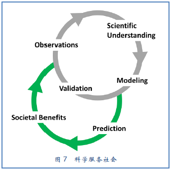 如图7中概念性的展示,观测推进了科学认知(经常基于来自详尽的外场试验的洞察)和建立模型,后者需要通过增加的观测(图7中的灰色线)进一步验证。社会效益来自预报(图7中绿色线),能够如Ziolkowska et al.(2017)所述,有效地计划以减轻天气气候的影响。这一在反馈循环中的结果来自社会对科学事业的投入以通过改进观测和预报能力增加效益(例如,见Benjamin et al(2018)关于天气预报的评述)。Smith(2010)给出令人关注的事实:气象进步如何在事实上杜绝了因风切变造成的空难以及飓风预警如何挽救数千人的生命。当然,量化社会对科技投入的回报并不简单(依据研究领域),而且并不是立刻就清晰,正如Bornmann(2012)所思考的那样。