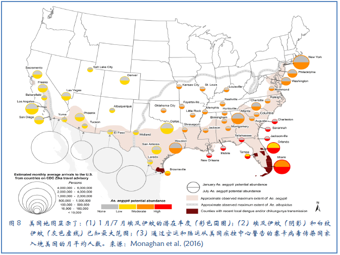 除了改进地球物理观测外,改善社会福利还需要在地方、区域和全球范围内开展与气候和天气有关的社会、经济和卫生活动的跨学科研究。例如,疾病爆发可受到天气和气候条件的显著影响,例如传播病毒的蚊子的繁殖和生存取决于温暖和潮湿天气。通过将气象信息与社会经济和旅游因素结合起来,捕捉蚊子的季节性。Monaghan et al.(2016)促进了寨卡病毒在美国蔓延的时间和地点的认识(图8)。这样的跨学科研究,有效地把气象观测与其他数据结合起来,将为卫生组织提供专门的预报,预测与寨卡病毒、登革热、脑膜炎和鼠疫等常见致命疾病爆发的开始和结束相关的天气状况。