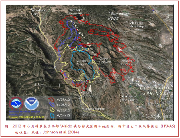 林火对生命和财产构成重要卫星。火点生产的烟柱引发空气质量问题,过火区域加剧了突发性洪水和侵蚀。天气信息不仅在火灾将高发时(例如,Erickson et al.2016;Page et al.2018),而且在判断火灾的扩展速度和救援人员面临的威胁是,都是非常重要的。易燃物干燥的环境驱动与大气条件有关,包括温度、湿度、降水和风,尽管火情传播有多快并不仅仅是近地面条件决定的,因为大范围火情可能演化成一个复杂、耦合的非线性动力系统(例如 Coen et al.2013;Johnson et al.2014;Peace et al.2016)。未来准确预报林火,需要计算机模式能够模拟控制火情走势的高度局地化的风(例如,复杂地形)。除了复杂性,主要着火区能够改变局地天气,随火势生成的风可能远强于林火区以外。这些火区内部风有可能促使火情突然加速,强度增加,向不可预知方向扩展,或分解使得火区向多个方向扩展。Haupt et al.(2018c,第4节)和最近NRC(2017)报告对林火火情研究和管理给出了历史回顾。现代观测工具的使用,使得不同植被和燃烧物属性的评估越来越多(例如通过卫星遥感),潜在火点灾害的监测(闪电信息)以及利用快速布设移动平台对林火天气及其特征的考察登也不断出现(例如Kiefer et al.2012; Clements et al.2018)。