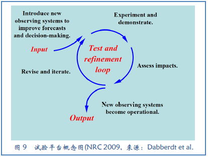 在试验平台试验和评估新观测系统的能力(图9)在NRC(2009)报告中进行了讨论,尽管这一概念出现的时间要早很多。这一原型设计方法还可以用于向决策者引进新的支持能力,因为他们可以学习在可空环境中利用新能力,同时提供有价值的用户反馈。例如,目前在芬兰的赫尔辛基(Koskinen et al.2011)、中国上海(Tan et al.2015)和德克萨斯的Dallas – Fort Worth(Pulkkinen et al.2018)出现的城市试验平台。Muller et al.(2013)评估了城市气象网的状态,研究了与这类网相关的基础科学和后勤问题。