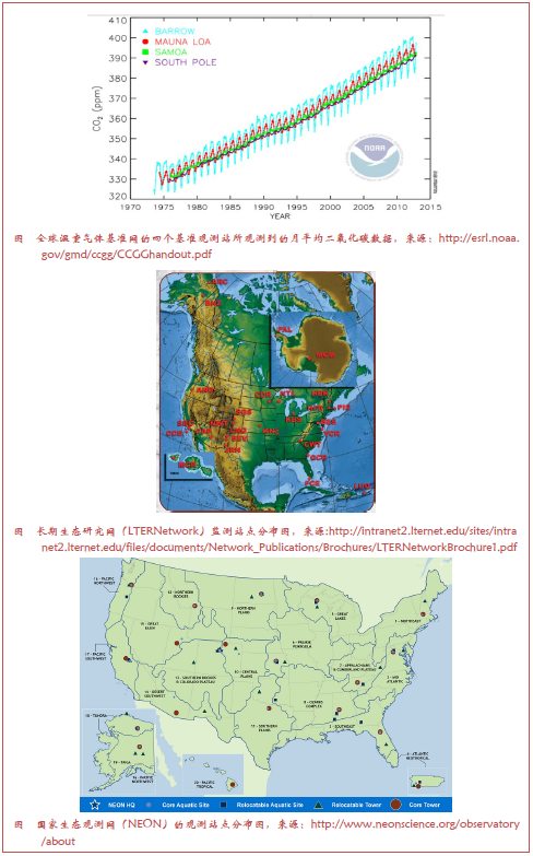 但是,预报天气的需求与预测气候的需求不同,因为天气预报主要依靠初始条件,而气候预测 依赖于长期数据。基林曲线的一个教训是需要一个数据质量控制的有力和一致方法,可以长期应用,Callendar(1958)对大气CO2较早的研究就是一个例子,但也适于应用于很多长期观测战略,例如WMO的GOS所提出的。我们对CO2和其他温室气体作用的认识,不仅依靠较早的直接采样工作,还依赖仔细和准确的早期红外辐射观测系统(例如Callendar 1938)。长期、可持续的生态观测战略是基林在Mauna Loa开展观测的标志,近来越来越多地应用于一些生态观测系统网,如全球温室气体基准网1、长期生态研究网(1980年建立2)、1996年建立的AmeriFlux网(Boden et al.2013)和国家生态观测网(NEON,预计2018年全面投入运行3)。DOE的ARM项目利用相似的长期方法记录云在地球辐射收支中的作用。