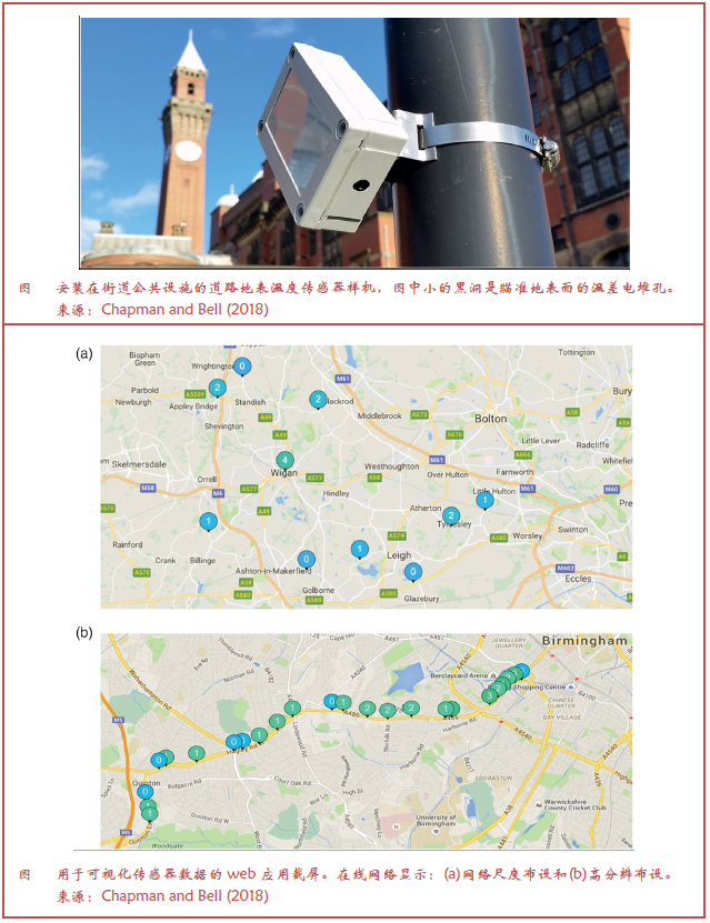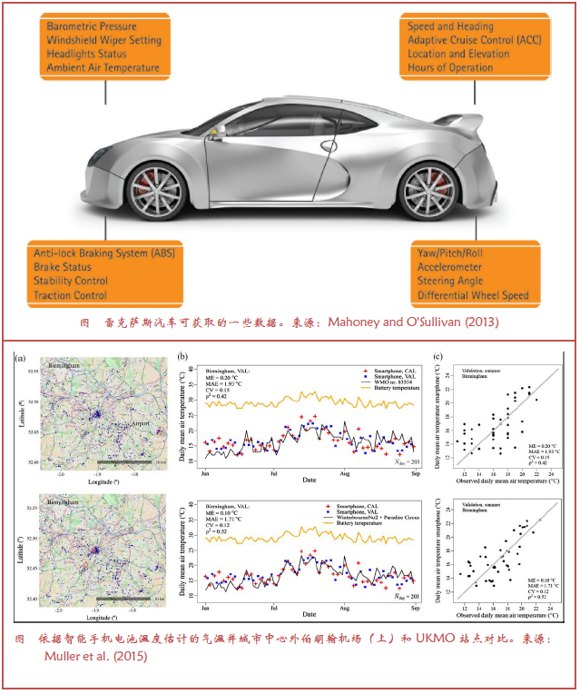 目前气象传感器的小型化向低端消费者提供天气监测设备,几乎可以放置在任何地方,包括地面和空中交通工具。相互联系的交通工具(例如Mahoney and O’Sullivan 2013)和人群(Muller et al. 2015)提供的信息,极大地促进了天气相关信息的获取,这是以前无法实时实现的。物联网(IoT)使得通过低功率无线通信手段和云端存储获取和操作数据。Chapman and Bell(2018)讨论了IoT对于观测和预的展示和转化潜在应用的例子。