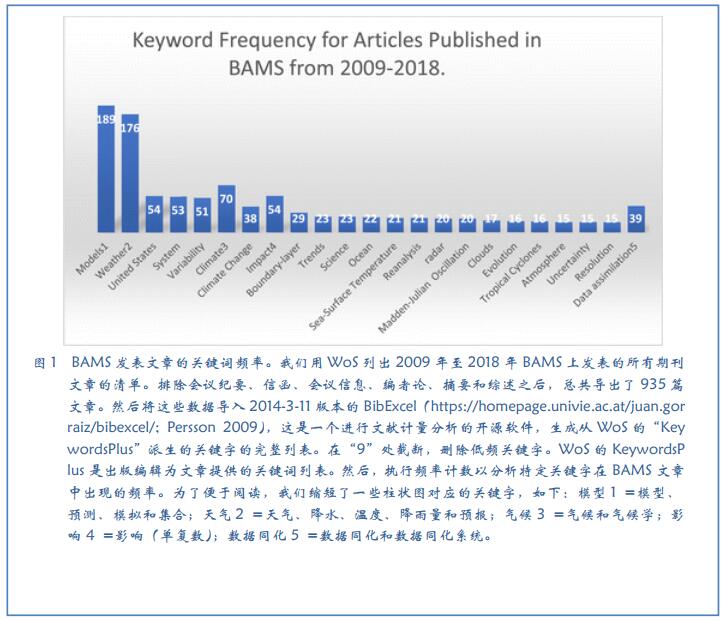 BAMS 直到20世纪70年代才开始较为常规地发布社会科学感兴趣的跨学科问题,例如天气和气候及极端事件对社会的影响,城市化与天气模式之间的关联, 预报和预警的社会科学专业决策,预报和警报的传播,天气和气候信息的经济价值,决策中信息的使用,以及特定天气或气候的损害归因。不过 BAMS 的关键主题仍集中在天气和气候上(图1)。