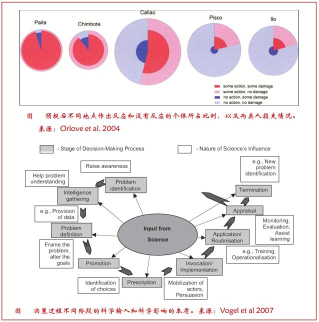 早期研究季节到年际气候预测应用的实验,集中在巴西东北地区、秘鲁和智利、非洲南部、澳大利亚和美国的一些地区(Hammer 1994; Pulwarty and Melis 2001; Broad et al. 2002;Orlove et al. 2004; Vogel et al. 2007)。不少实验表明,这些预报的实际使用令人失望,低于科学家的预期,并且充满了公平性和潜在的意外后果等问题(Lemos and Dilling 2007)。 20 世纪 80年代和 90 年代该领域的演变过程中,社会科学家对两个相耦合的问题越来越感兴趣:为什么决策者使用或不使用气候信息,以及气候研究要如何实行才能更适用于决策(Vogel and O'Brien 2006; Patt et al. 2007; Dilling and Lemos 2011; Lemos et al. 2012)。