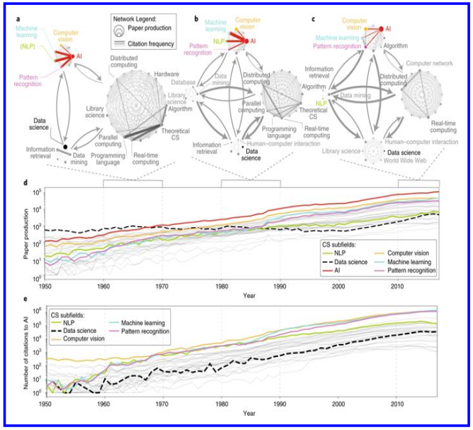 《自然-机器智慧》创刊版发表了针对 AI 研究文献计量学分析文章,作者借Microsoft Academic Graph 工具研究了自 1950 年以来相关论文的走向,发现早期 AI 相关的领域主要集中在哲学、地理学和艺术,但现代 AI 研究则大量转向数学和计算机科学。相反,包括社会科学在内的其他学科,涉及 AI 的文章数并没有随着学科论文数量的增加等比例增长。(来源:《自然-机器智慧》)