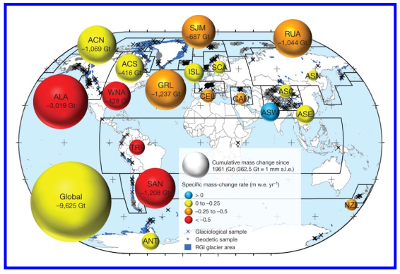 瑞士等多国学者梳理了1961-2016年全球19个一阶区域(图中用黑线区分)累积的区域和全球冰川质量平衡及其对海平面上升的贡献。其中阿拉斯加地区总质量改变约为?3,000Gt,相当于海平面上升8mm,是最大的贡献区域。(来源:Nature)