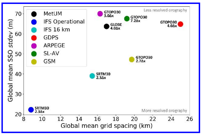 英国气象局与多国气象机构合作者,针对地形在天气、气候模式的表征,包括网格尺度地形和次网格尺度地形(subgrid-scaleorography,SSO)所带来的不确定性展开研究。图中给出用模式分辨率表征的SSO的标准差(图中?x表示模式网格距)。该项研究在JAMES(《模拟地球系统进展杂志》)上发表。(来源:JAMES)(论文原文见附件1.2)