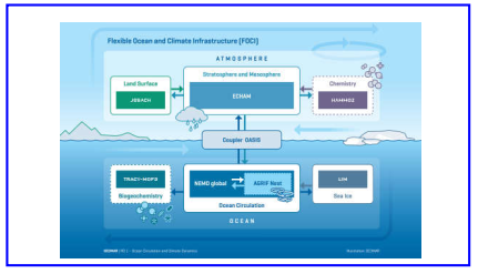 不断发展和改进气候数值模式是昂贵且复杂的。最近,德国亥姆霍兹基尔海洋研究中心(GEOMAR)研究人员提出一个新的模块化系统——FOCI(Flexible Ocean and Climate Infrastructure),该系统由不同的模块组成,可以根据研究问题和可用的计算能力行调整和使用。FOCI 以马普气象研究所的地球系统模式为基础,并用 NEMO 模式对海洋进了修改,能够以更高分辨率来表示海洋中的小尺度过程。该系统有助于科学家在不同时间尺下研究许多新问题,例如平流层臭氧空洞对南大洋环流的影响,或者墨西哥湾流对大气过程影响等。图为 FOCI 系统示意图,虚线框表示可选模块。(来源:GEOMAR)