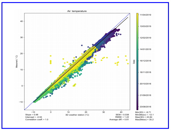 根据美国大气研究大学联合会(UCAR)3D 打印自动气象站倡议的计划和指导,研究人员利用 3D 打印部件和低成本传感器建造了一个气象站,与俄克拉荷马 Mesonet 站一起部署,将其性能与标准商业传感器进行比较并确定其使用寿命和耐用性。研究人员进行了为期 8 个月的实地部署,收集了温度、相对湿度、大气压力、风速和风向、太阳辐射和降水量测量值。除风向外,测量结果与商业传感器相当。由于一些传感器和 3d 打印部件在部署期间中出现了故障,该系统的寿命和耐久性各不相同。总体而言,这些低成本传感器可与更昂贵的商业传感器相媲美,并且可以作为短期部署资源有限的研究人员和教育工作者的可行替代方案。通过适当的维护和定期更换传感器和 3d 打印部件,长期部署是可行的。图为低成本MCP9808 温度传感器(x)和俄克拉何马 Mesonet(y)的比较。(来源:Science Daily)