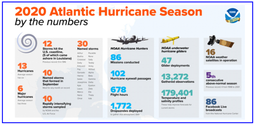 极度活跃的 2020 年大西洋飓风季节即将结束,美国大陆出现了创纪录的 30 场命名风暴和 12 场登陆风暴。30 个被命名的风暴(时速 39 英里以上)中有 13 个变成了飓风(时速 74英里以上),其中 6 个为大型飓风(时速 111 英里以上)。这是有记录以来一年中最多的风暴,超过了 2005 年的 28 次,也是有记录以来飓风数量第二高。(