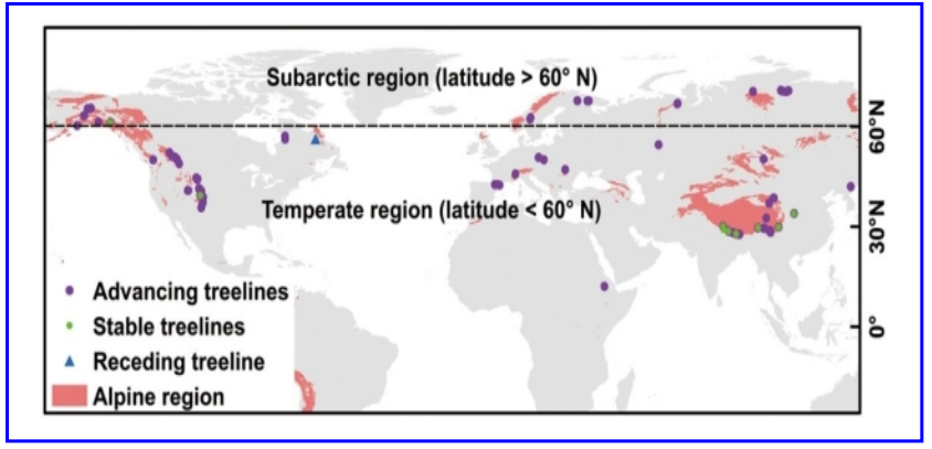 树线是指树木分布的海拔上限。科研人员研究收集了 143 个北半球天然树线样点,分析了 1901 年至 2018 年不同样点树线的变化速率。研究发现,88.8%的样点树线上升,10.5%的样点树线位置保持不变,仅有 0.7%的样点下降。图中紫色圆点为上升树线,绿色圆点为稳定树线,蓝色三角形样点为退缩树线样点。研究指出,秋季降水量和冬季变暖共同驱动北半球高山树线的变化速率,且降水的贡献大于温度(来源:Global Ecology and Biogeography)