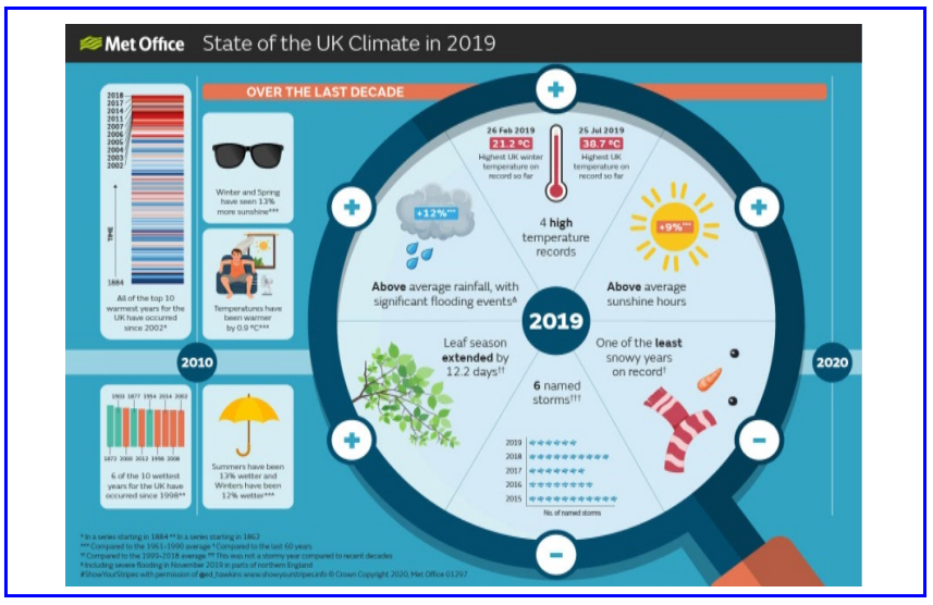英国气候状况系列的第六份报告证实,最近 10 年(2010—2019 年)全英国平均比 1961—1990 年期间温暖 0.9℃,其中 2019 年比 1961—1990 年的长期平均值高出 1.1℃。2019 年是1884 年以来第 12 个最暖的年份,最引人注目的是创造了 4 项英国高温纪录。2019 年英国霜冻连续第 6 年低于平均水平,也是有记录以来降雪最少的年份之一。(