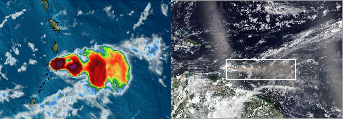 位于加勒比海圣文森特岛上的La Soufrière火山休眠40多年后,2021年4月9日开始连续多次喷发。火山灰柱冲上约万米高空,圣文森特岛从南到北,几乎都受到了火山灰的影响。左图为卫星拍摄到的4月11日火山喷发时的影像,圣文森特上空深色的火山灰柱与周围地区的白云形成鲜明对比。像La Soufrière这样的大型火山爆发经常会产生闪电。维萨拉的气象学家表示,在截至4月12日上午的72小时内,在火山喷发过程中检测到超过1200道闪电。来自ECMWF的计算机模拟预测(右图)显示,由La Soufrière火山产生的SO2可能会到达远至北非的东部地区。(来源:Weather Underground)