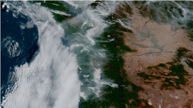图1 GOES-18 GeoColor卫星图像显示,2022年10月17日,随着太平洋西北海岸的烟雾持续存在,山谷雾逐渐消失。NOAA卫星提供了用于模式和预测的关键数据,以及在动态火灾环境中挽救生命的潜在信息。