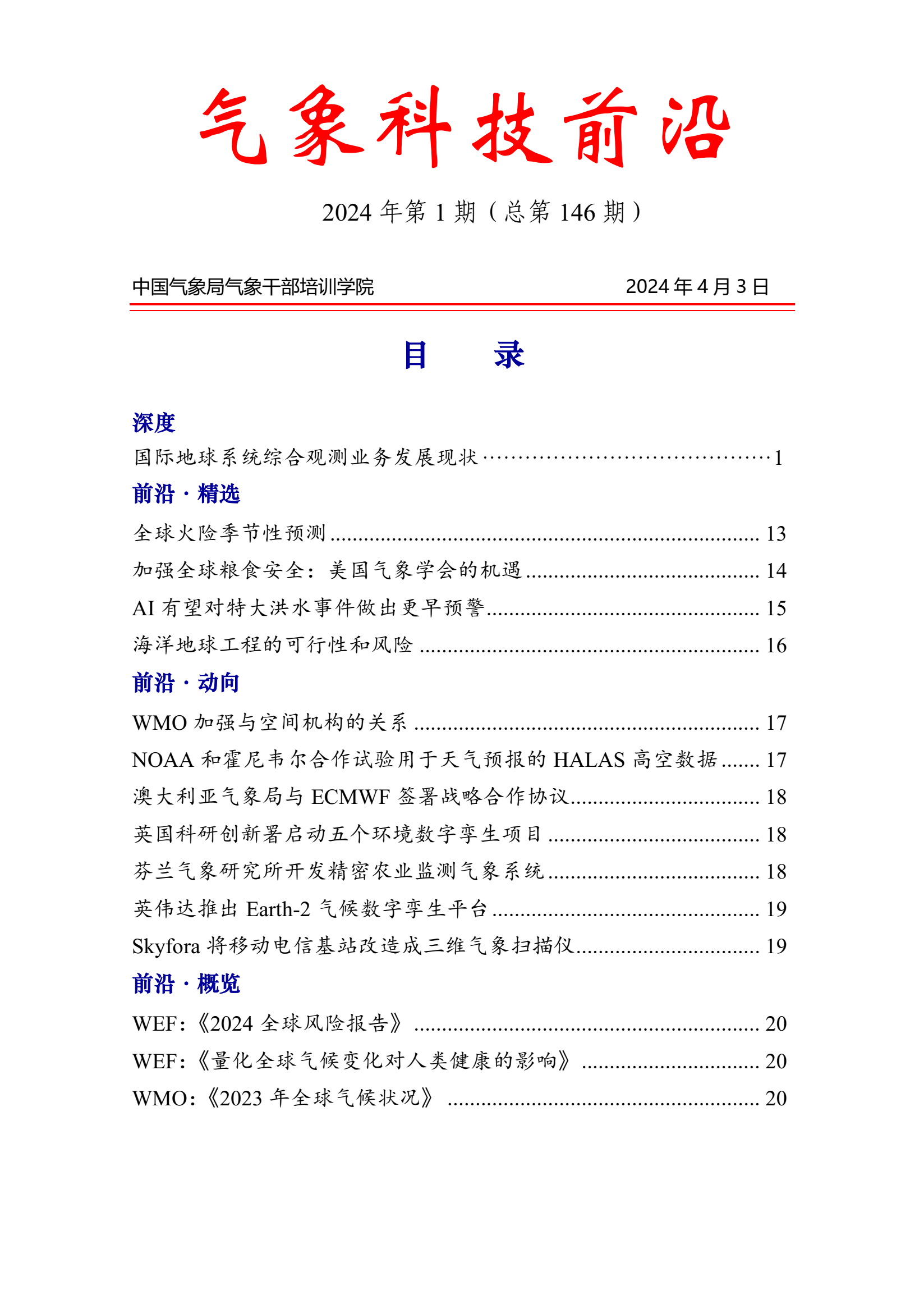 4月2日发布的2024年第1期《气象科技前沿》,重点关注地球系统综合观测,并汇总国际气象科技最新研究进展、气象行业动态,为科研人员提供信息参考。