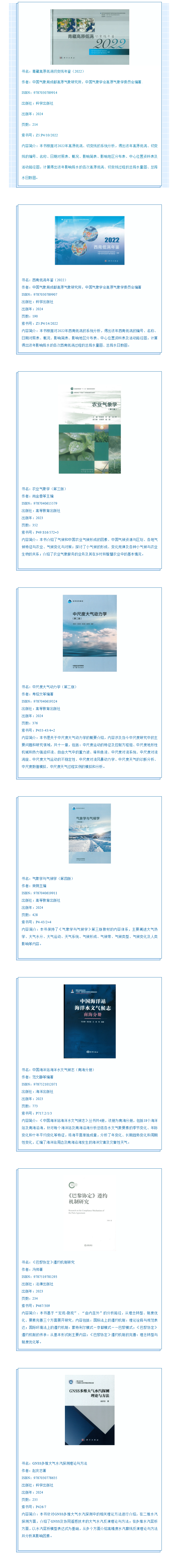 收藏国内外气象专业的各种出版物是中国气象局图书馆的重要职能与任务。本馆现有藏书近17万册,其中中文图书7万余册。中国气象局图书馆公众号将定期向读者推送我馆最新上架的中文图书信息,欢迎有兴趣的读者到馆阅读。